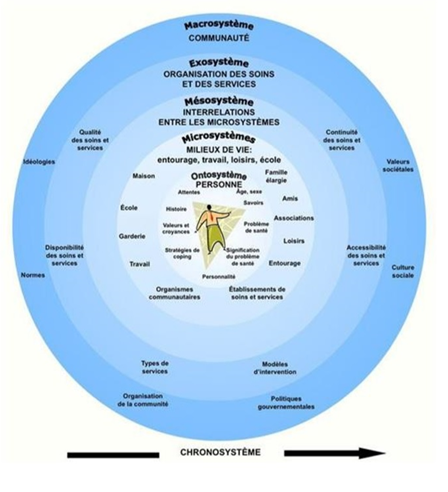 Cette approche considère le développement intégral de l’individu comme étant fonction des interactions produites entre cet individu et les différents systèmes qui l’entourent (la famille, les voisins, l’école, les pairs, la culture, etc.), ainsi que des interactions élaborées entre ces systèmes eux-mêmes. Le modèle écologique est constitué de multiples systèmes connus sous le nom de la niche écologique et englobe l’ontosystème, le microsystème, le mésosystème, l’exosystème, le macrosystème et le chronosystème (Belsky, 1980[2] ; Bronfenbrenner, 1979)