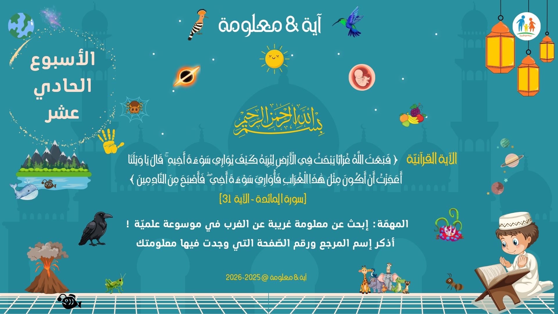 - يتأمّل الطفل كيف أن الله سبحانه يعلّم الإنسان من خلال مخلوق غير متوقَّع.