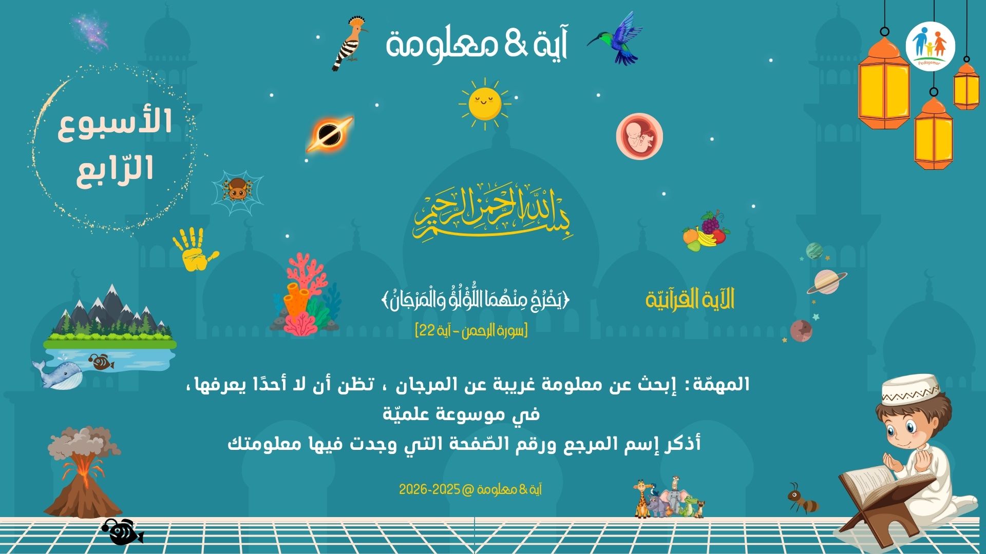 يتأمل الطفل في رحمة الله التي جعلت الشعاب المرجانية مأوى وآمنًا لآلاف الكائنات البحرية، تحفظها من المفترسات وتوفر لها الطعام.