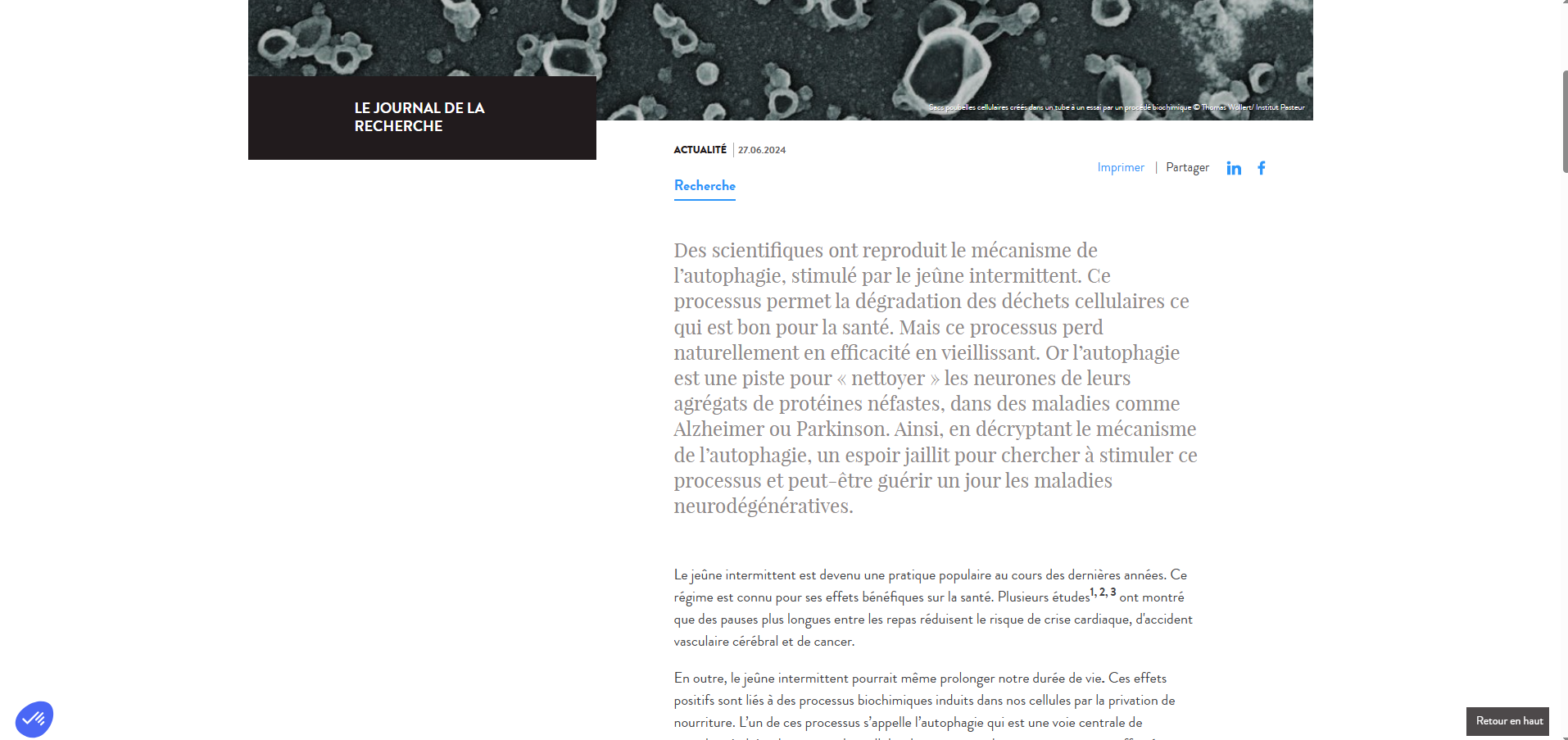 Des scientifiques ont reproduit le mécanisme de l’autophagie, stimulé par le jeûne intermittent. Ce processus permet la dégradation des déchets cellulaires ce qui est bon pour la santé. Mais ce processus perd naturellement en efficacité en vieillissant. Or l’autophagie est une piste pour « nettoyer » les neurones de leurs agrégats de protéines néfastes, dans des maladies comme Alzheimer ou Parkinson. Ainsi, en décryptant le mécanisme de l’autophagie, un espoir jaillit pour chercher à stimuler ce processus et peut-être guérir un jour les maladies neurodégénératives.