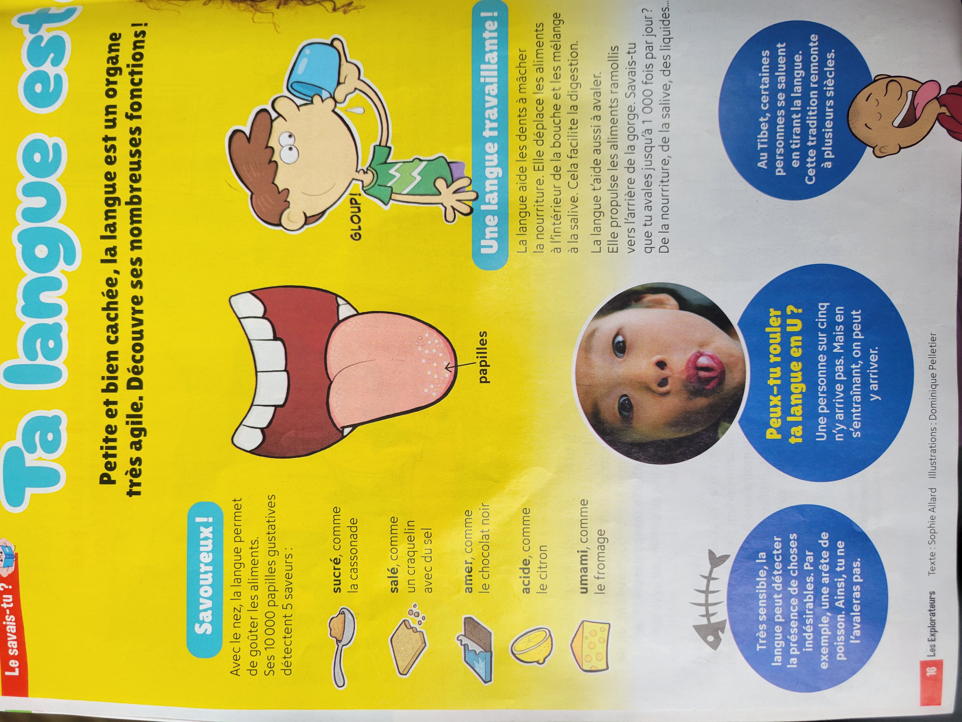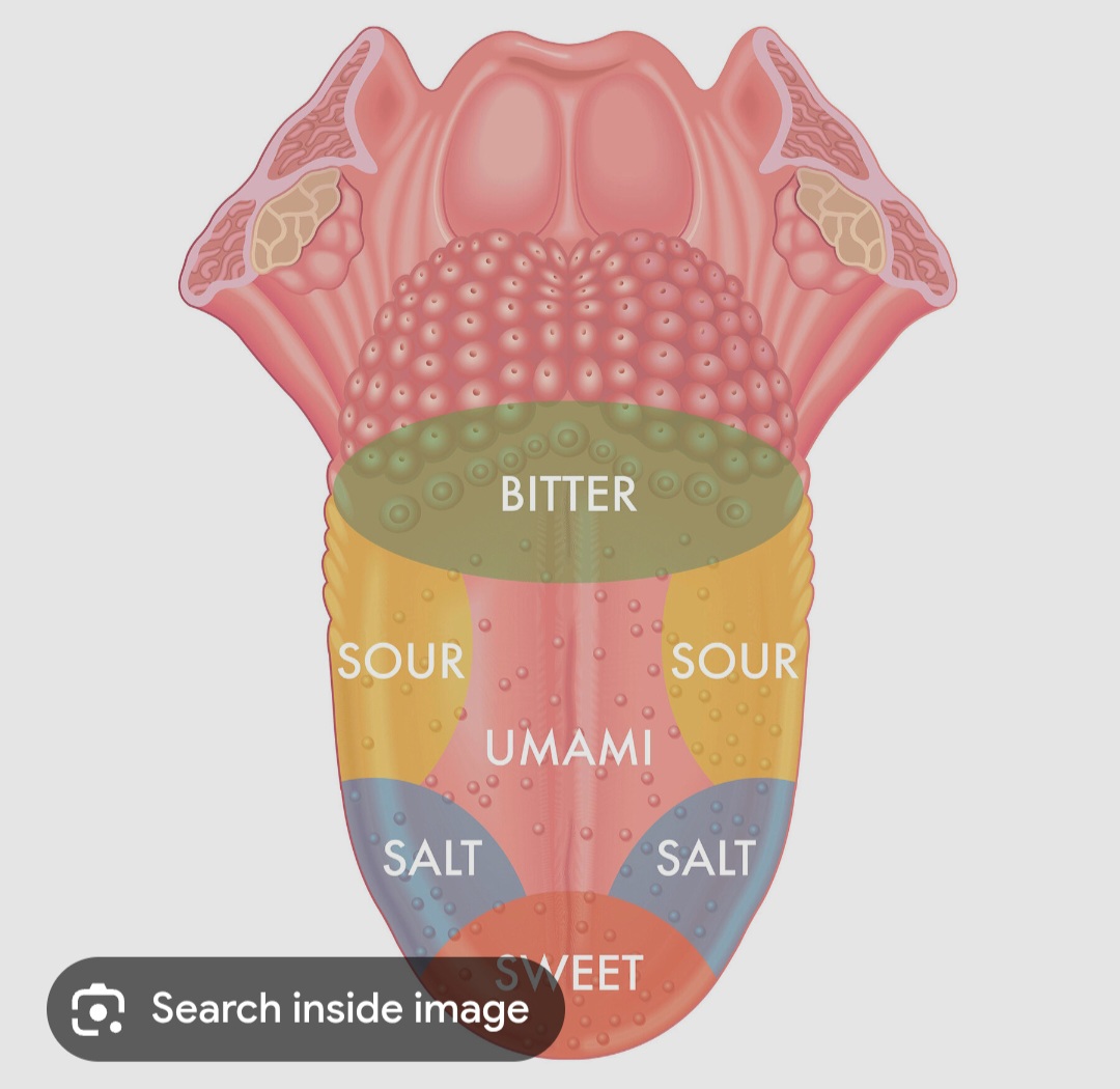 1)Il y a 5 saveurs de base, sucré, salé, acide, amer et umami. Il y a des espaces différentes sur notre langues qui sont capables de gouter la saveur qui leur est assigné.( photo a l'appuie)