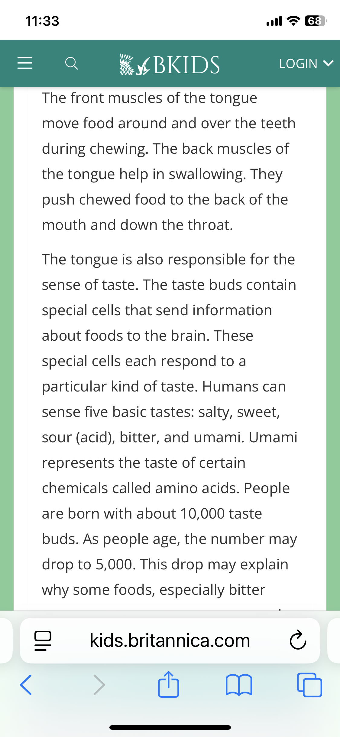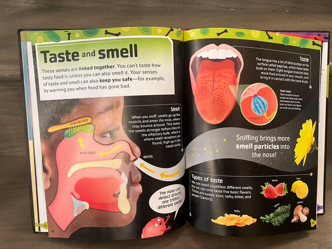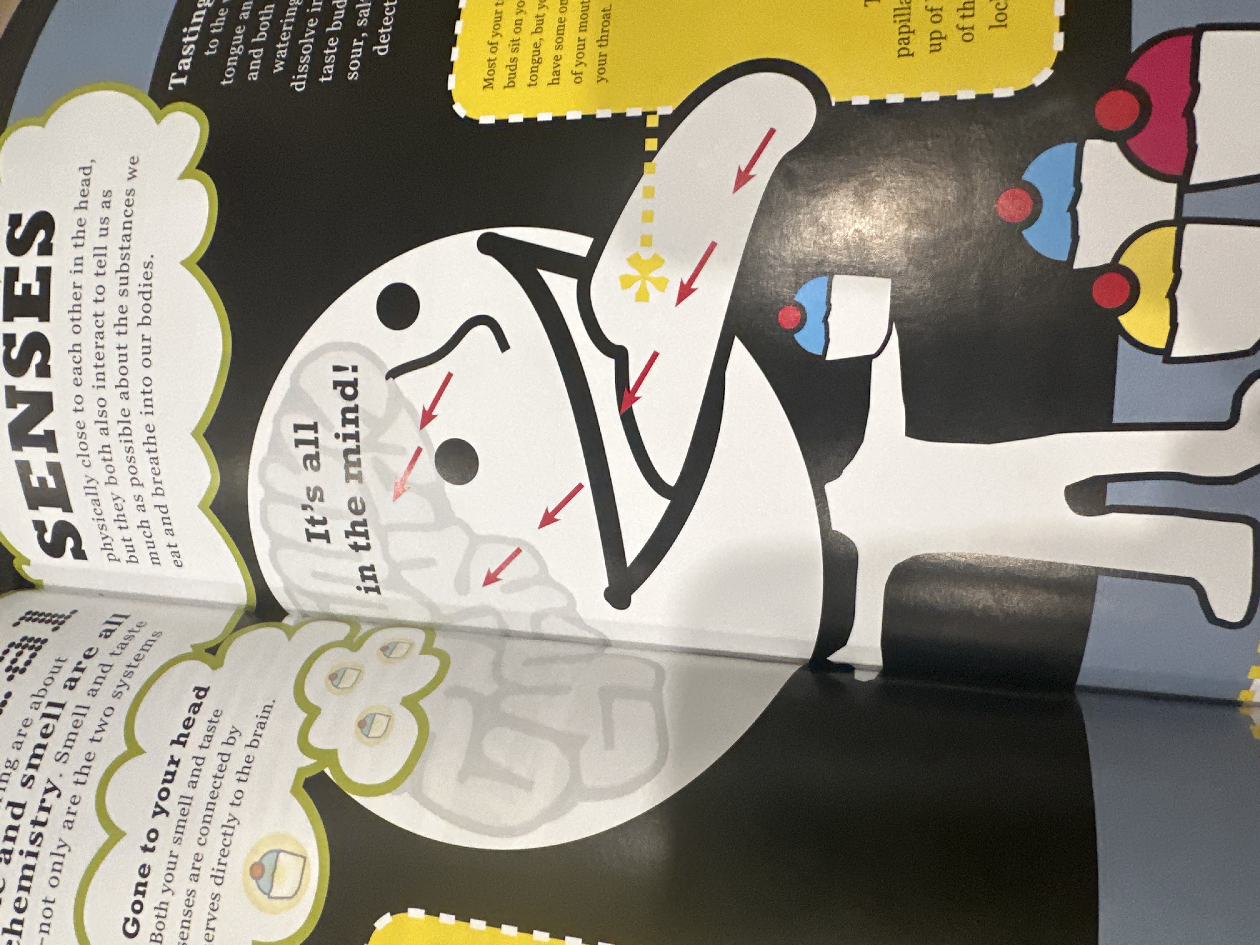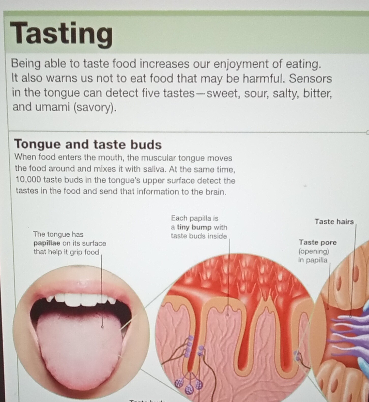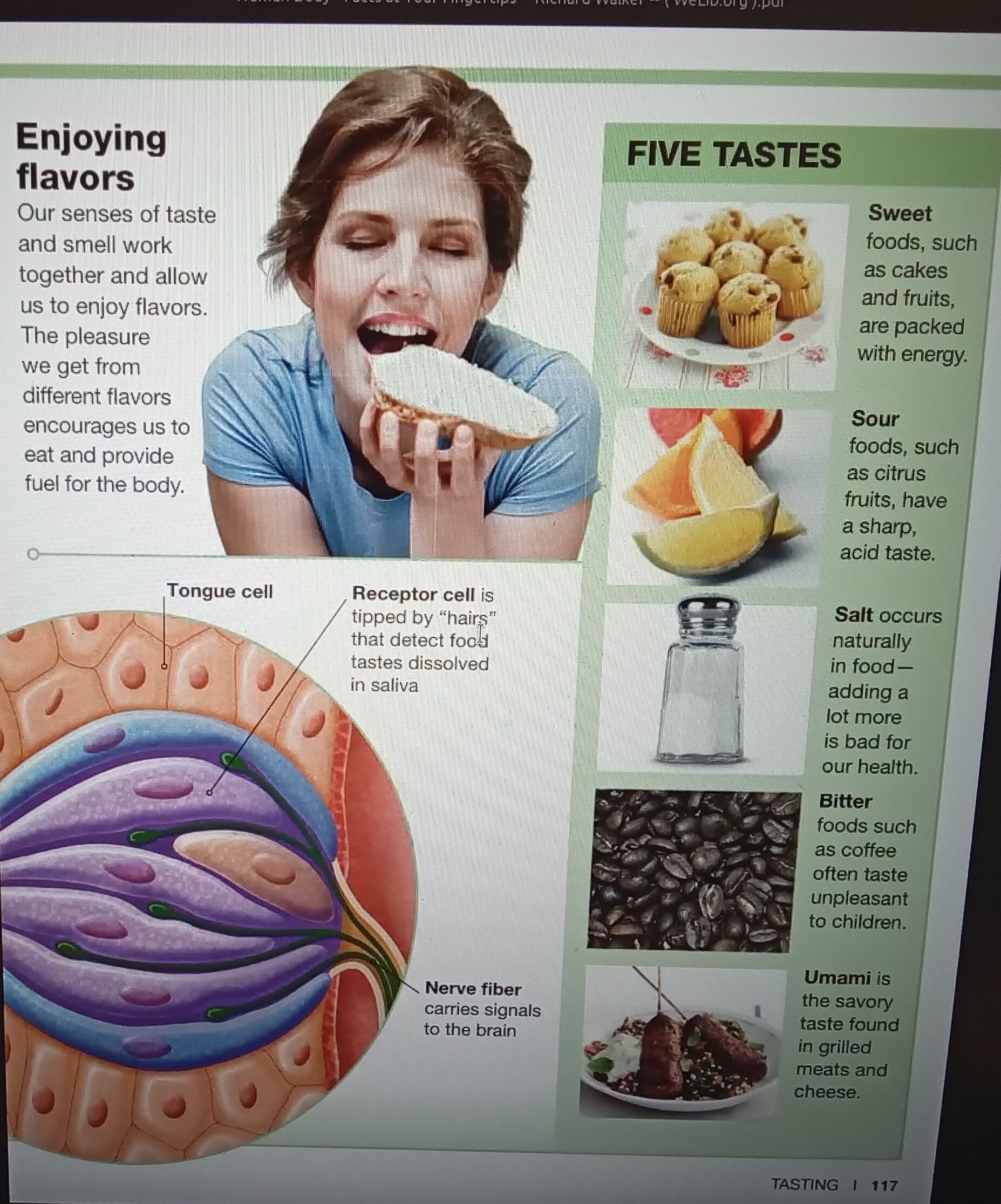Being able to taste food increases our enjoyment of eating. It also warns us not to eat food that may be harmful. Sensors in the tongue can detect five tastes-sweet sour salty bitter and umami (savory). When food enters the mouth the muscular tongue moves the food around and mixes it with saliva. At the same time, 10,000 taste buds in the tongues of her surface detect The taste in the food and send the information to the brain. The tongue has papillae on its surface that help it grip food .each papilla is a tiny bump with taste buds inside. Taste buds contain receptor cells. Taste pore (opening) in papilla. Our symptoms of face and small work together and and allow us to enjoy flavors. Receptor cell is tipped by hairs and said that the kids food tastes dissolved in saliva. Nerve fiber carries signals to the brain. The pleasure we get from different flavors encourages us to eat and provide fuel for our body. The five tastes are sweets food such as cakes and fruits are packed with energy. Sour food such as citrus fruits have a sharp acid taste. Fault appears naturally in food adding a lot more is bad for our health. Better foods such as coffee often taste unpleasant to children umami is the savory taste found in grilled meat and cheese