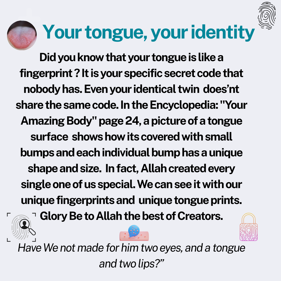 Did you know that your tongue is like a fingerprint ? It is your specific secret code that nobody has. Even your identical twin does’nt share the same code. In the Encyclopedia: "Your Amazing Body" page 24, a picture of a tongue surface shows how its covered with small bumps and each individual bump has a unique shape and size. In fact, Allah created every single one of us special. We can see it with our unique fingerprints and unique tongue prints. Glory Be to Allah the best of Creators.