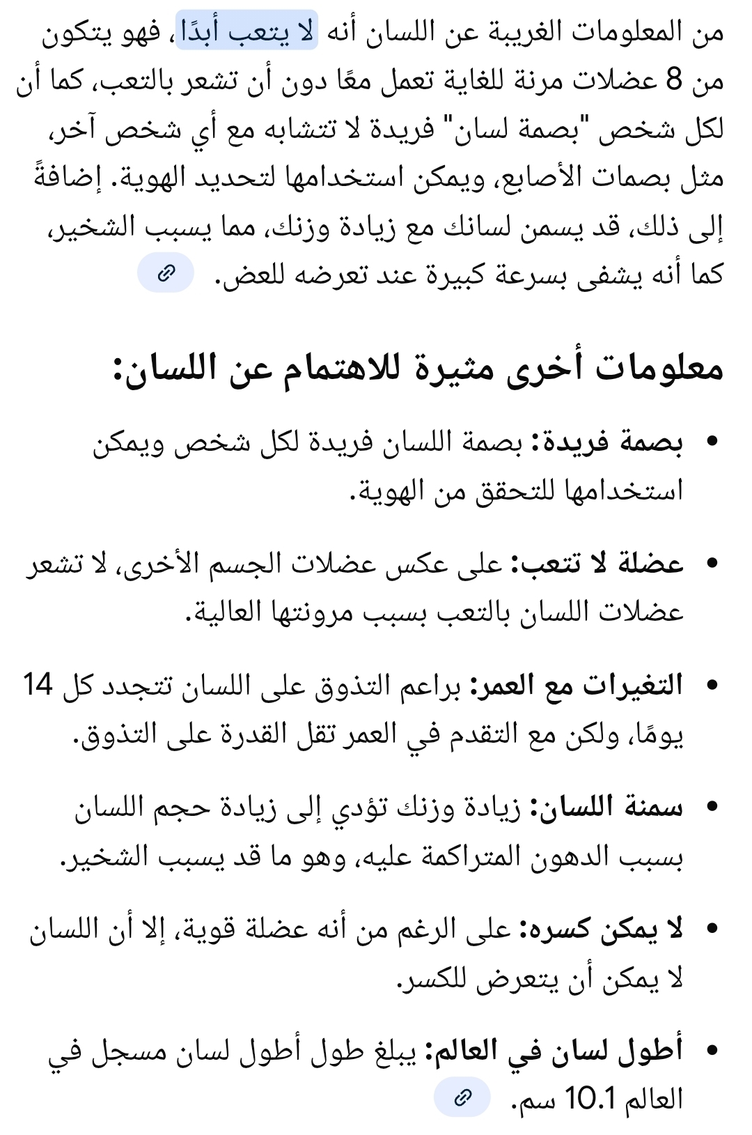 من المعلومات الغريبة عن اللسان أنه لا يتعب أبدًا، فهو يتكون من 8 عضلات مرنة للغاية تعمل معًا دون أن تشعر بالتعب، كما أن لكل شخص "بصمة لسان" فريدة لا تتشابه مع أي شخص آخر، مثل بصمات الأصابع، ويمكن استخدامها لتحديد الهوية. إضافةً إلى ذلك، قد يسمن لسانك مع زيادة وزنك، مما يسبب الشخير، كما أنه يشفى بسرعة كبيرة عند تعرضه للعض.