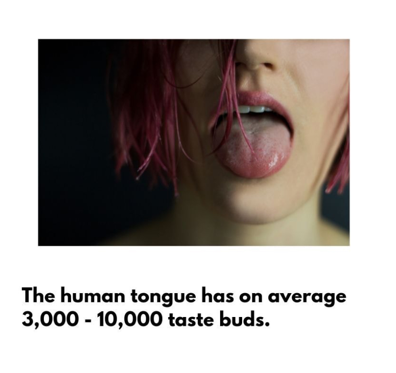 2) Dans notre bouche, il y a 9000 papilles gustatives. Ce sont des petites cellules sensorielles que nous ne pouvons pas voir. Elles sont situées dans les petites bosses que nous pouvons voir( qui s'appellent aussi papilles).