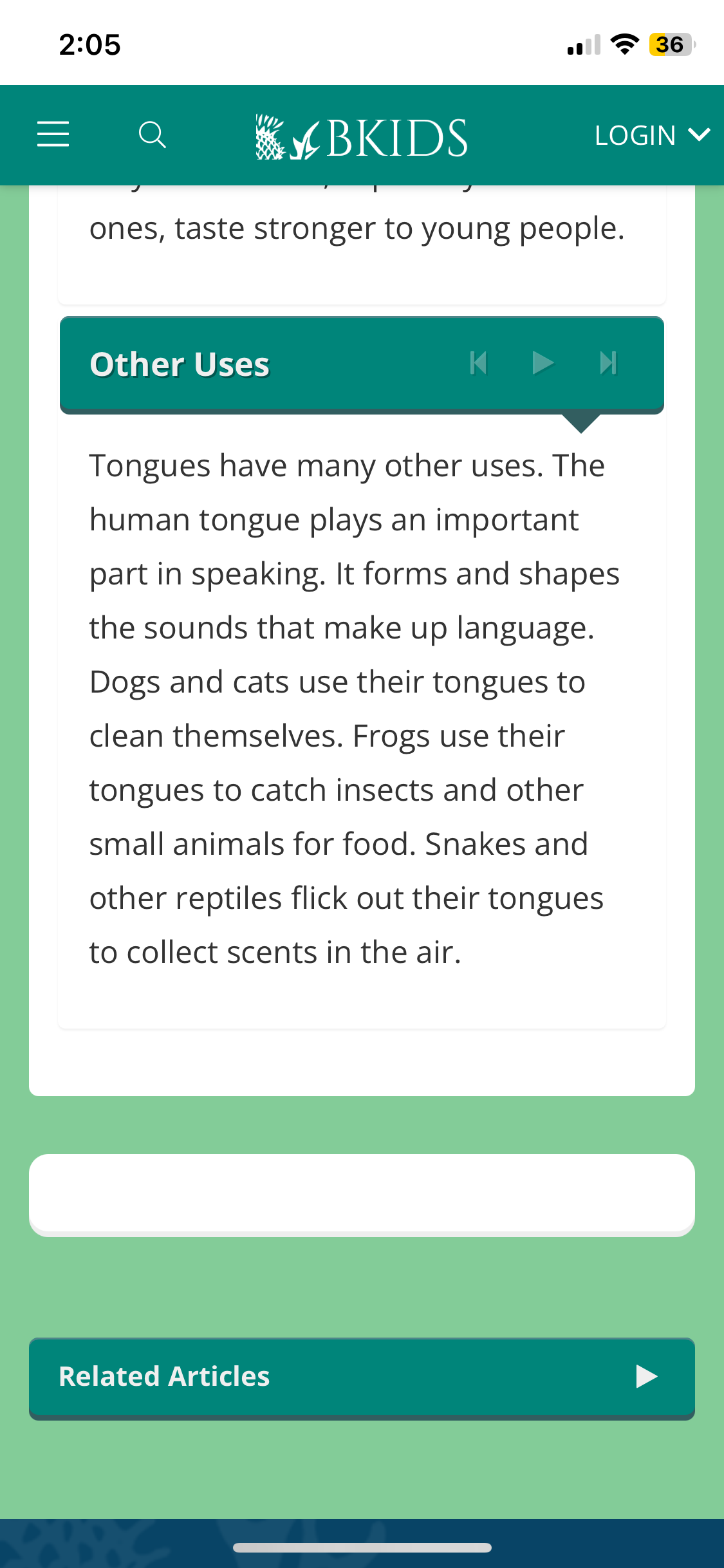 Tongues have many other uses. The human tongue plays an important part in speaking. It forms and shapes the sounds that make up language. Dogs and cats use their tongues to clean themselves. Frogs use their tongues to catch insects and other small animals for food. Snakes and other reptiles flick out their tongues to collect scents in the air.