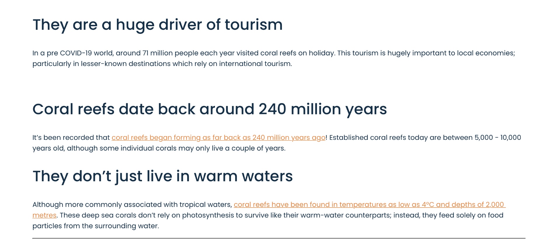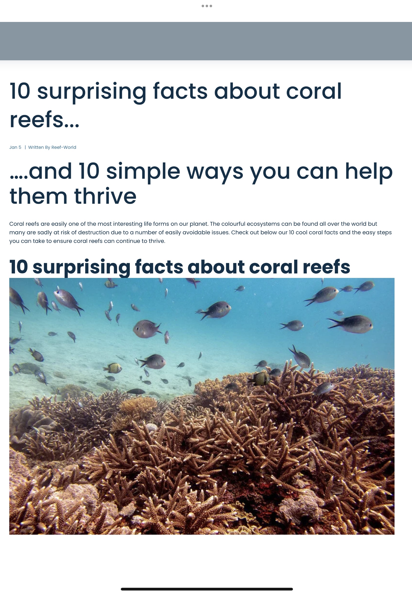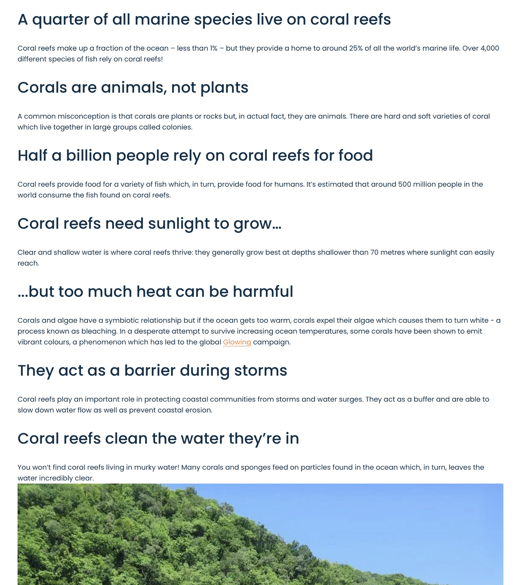 FUN FACTS -Coral reefs make up less than one percent of the area in the world's oceans. -About ten percent of the world’s food comes from coral reefs. -Coral reefs protect the coastline of 109 countries from water erosion, or the wearing away of land by water. -Twenty-five percent of ocean species live in or around coral reefs. -About thirty percent of coral reefs may be destroyed or severely damaged in the next ten years.