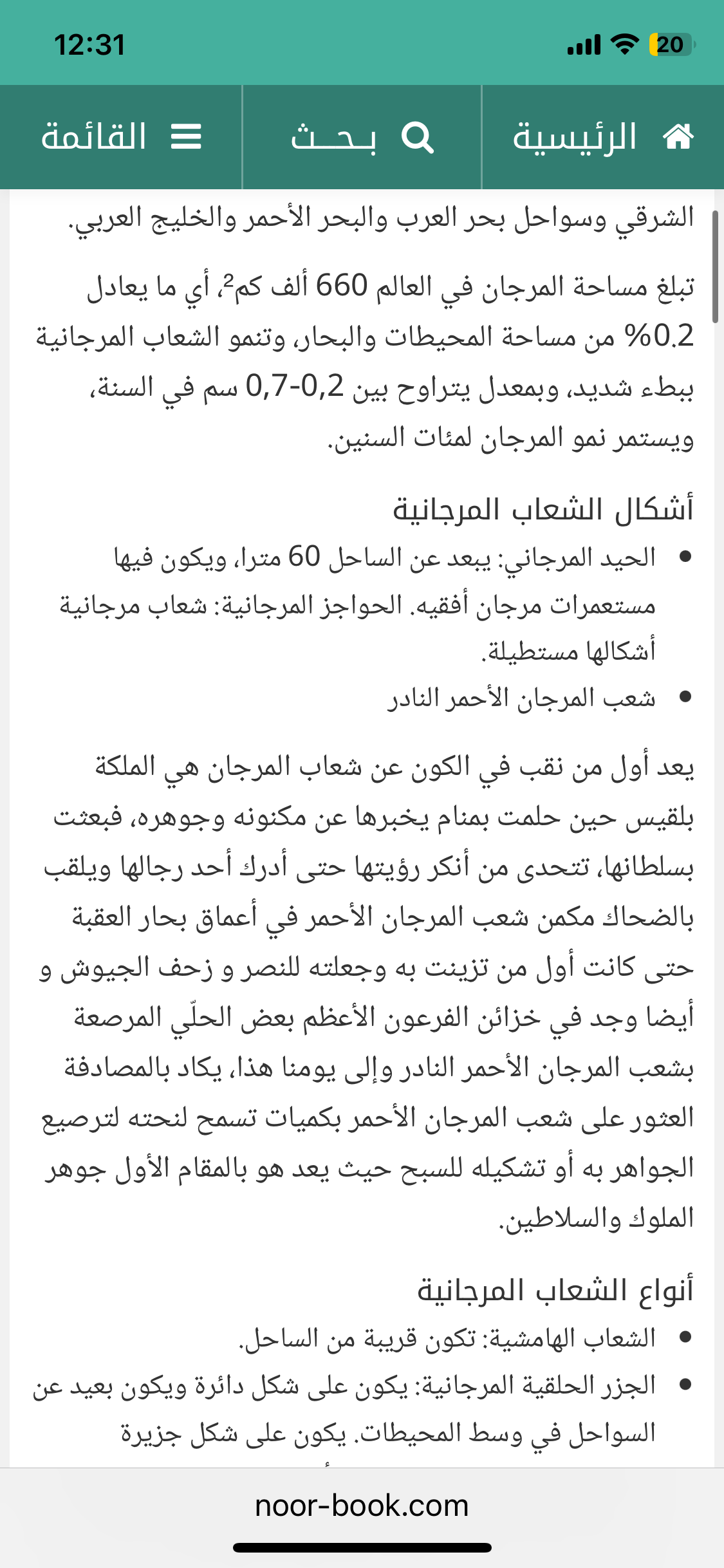 يعتبر المرجان من الثروات المهمة في البيئة البحرية وأشهر الاحجار الكريمة الثمينه ومن المواد القديمة المعروفة والتي تدخل في صناعة الحلي والتحفيات، بالرغم من انه لايعتبر من المعادن، بل يعد من المواد الحيوانية العضوية. ويدخل في تركيبه كاربونات الكالسيوم او حجر الكلس.