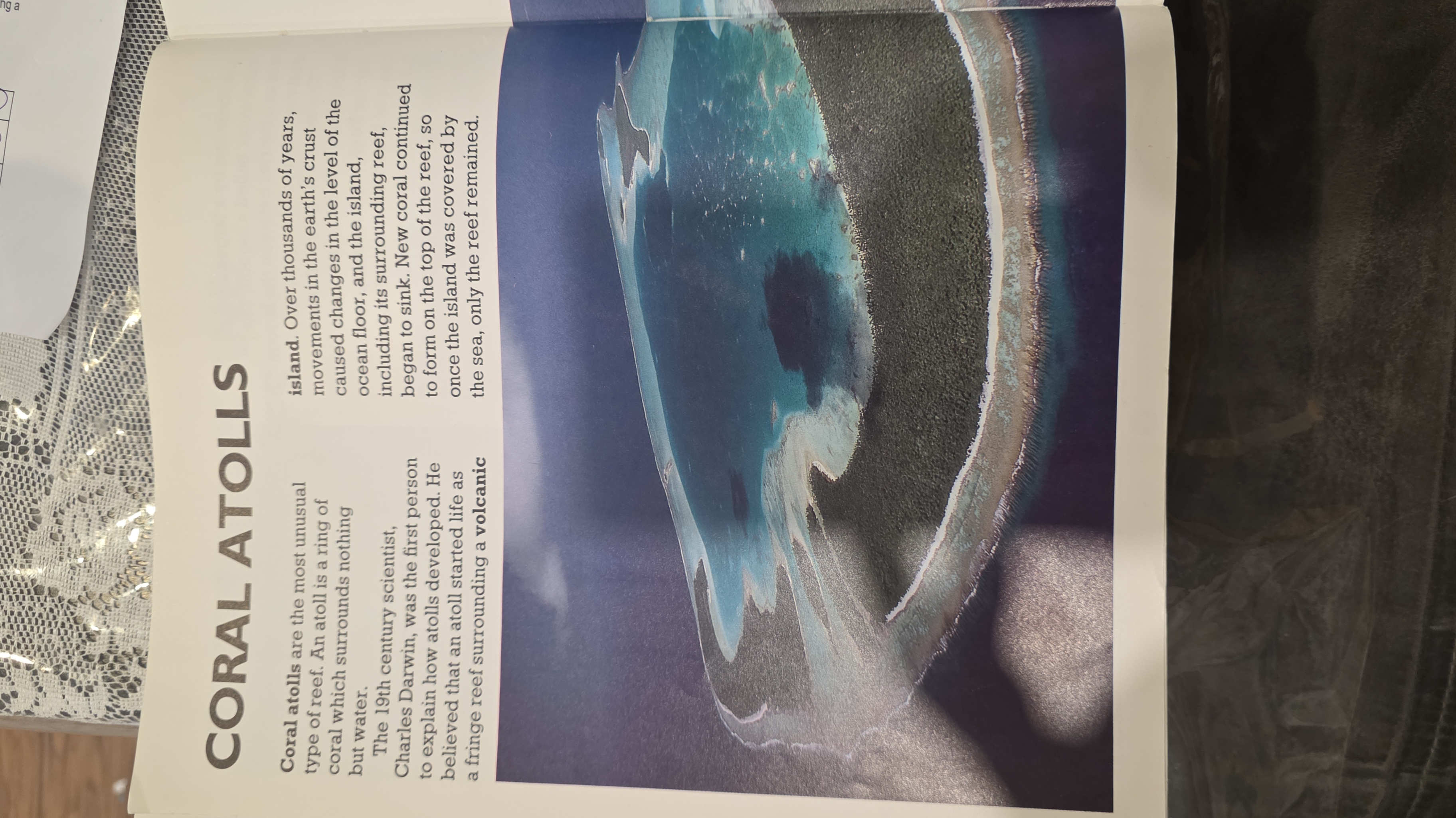 Coral atolls are the most unusual type of reef. An Atoll is a ring of Coral which surrounds nothing but water.the 19th century scientist Charles Darwin was the first person to explain how atolls developed. He believed that an atolls stared life as a fringe reef surrounding a volcanic.