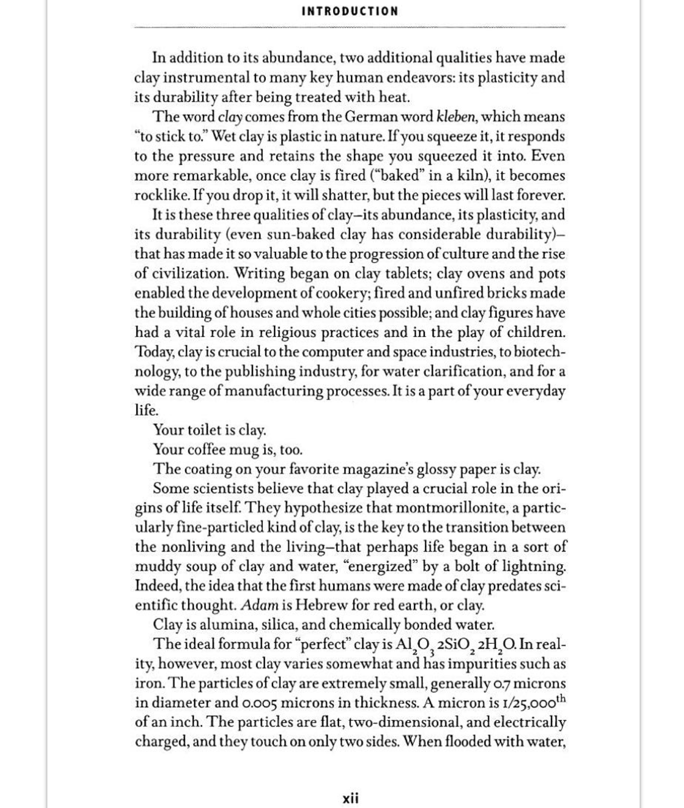Did you know that toilet is made out of Clay? Yes, Clay plays a big role in our everyday life because of its three main qualities: abundance, plasticity and durability. Clay last for a long time and tell us about the past civilisation. Like Ancient egypt who used it for their everyday Life from cooking to transporting goods. Till now its used for everything from making toilet, computer industry to Coffee mug. This is what to book: Clay: The History and Evolution of Humankind's Relationship with Earth's Most Primal Element by Suzanne Staubach explaions to us.