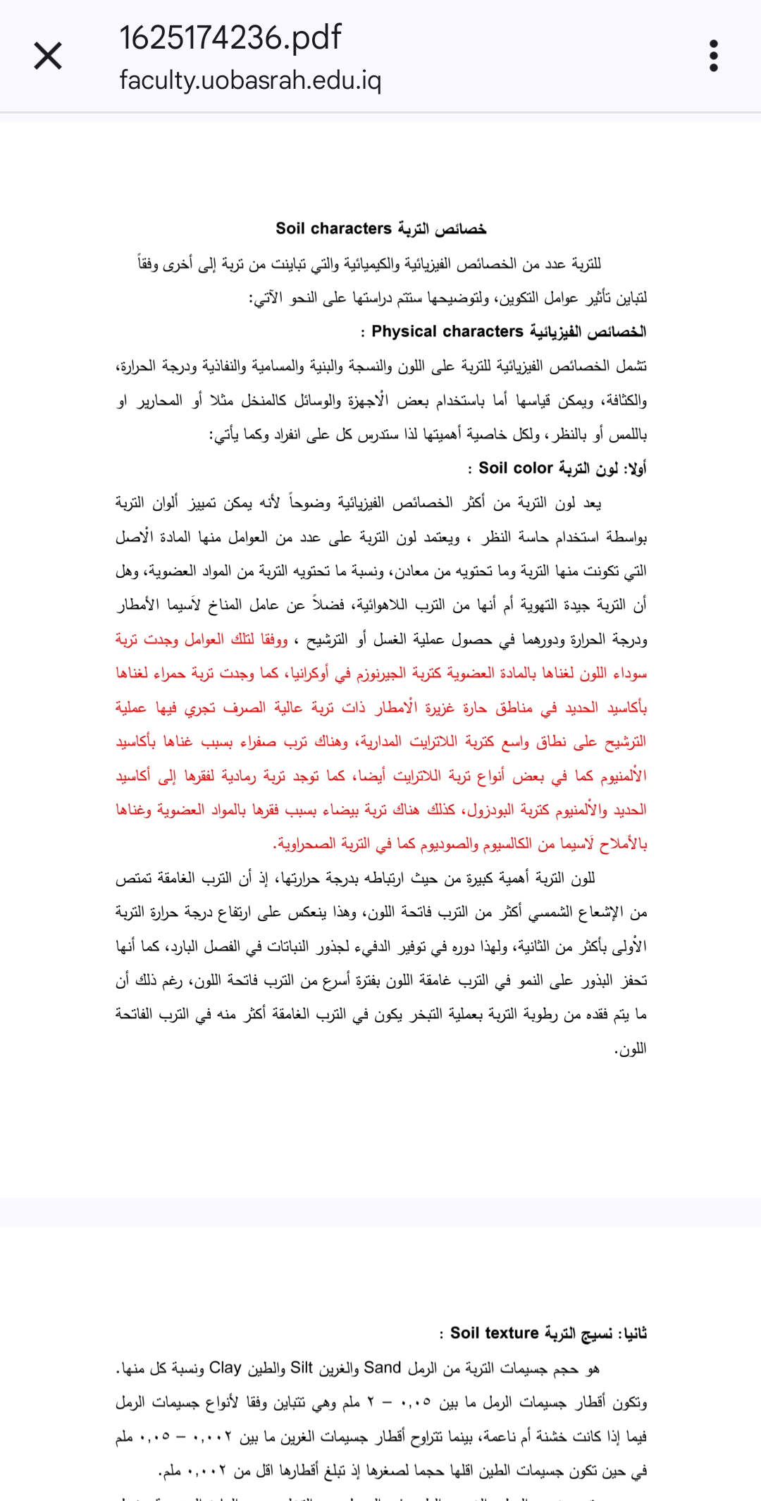 ألوان التّربة متعدّدة و تختلف بحسب المادة الأصل الّتي تكوّّنها والمعادن الّتي تحتويها والّلون الغامق للتّربة يسرّع نموّ البذور بسبب شدّة إمتصاصه للإشعاع الشّمسيّ .