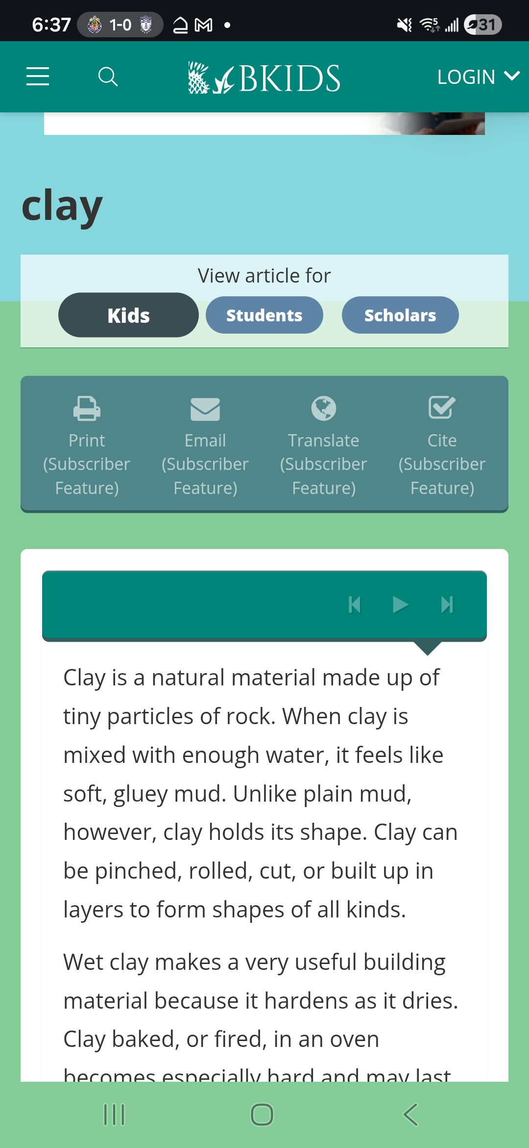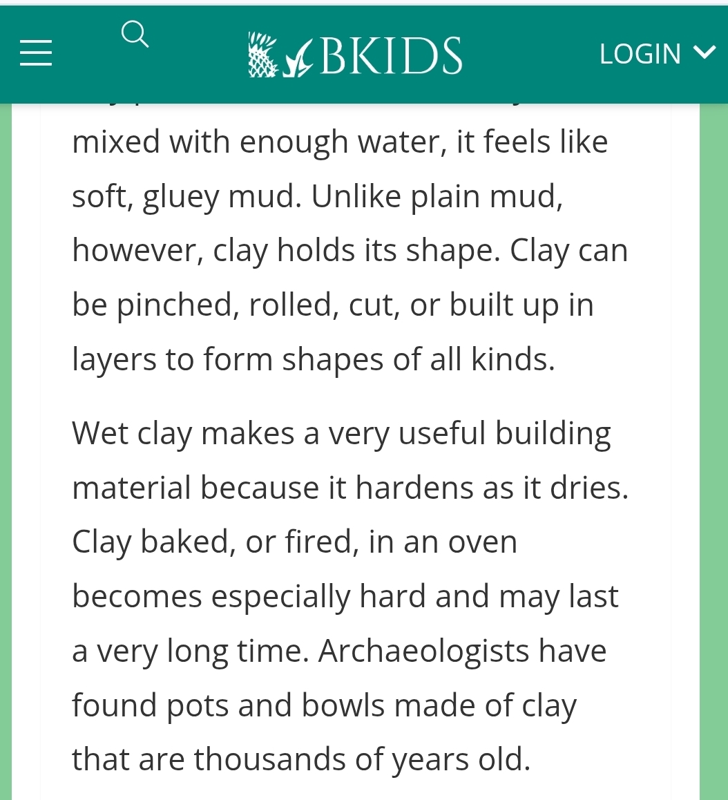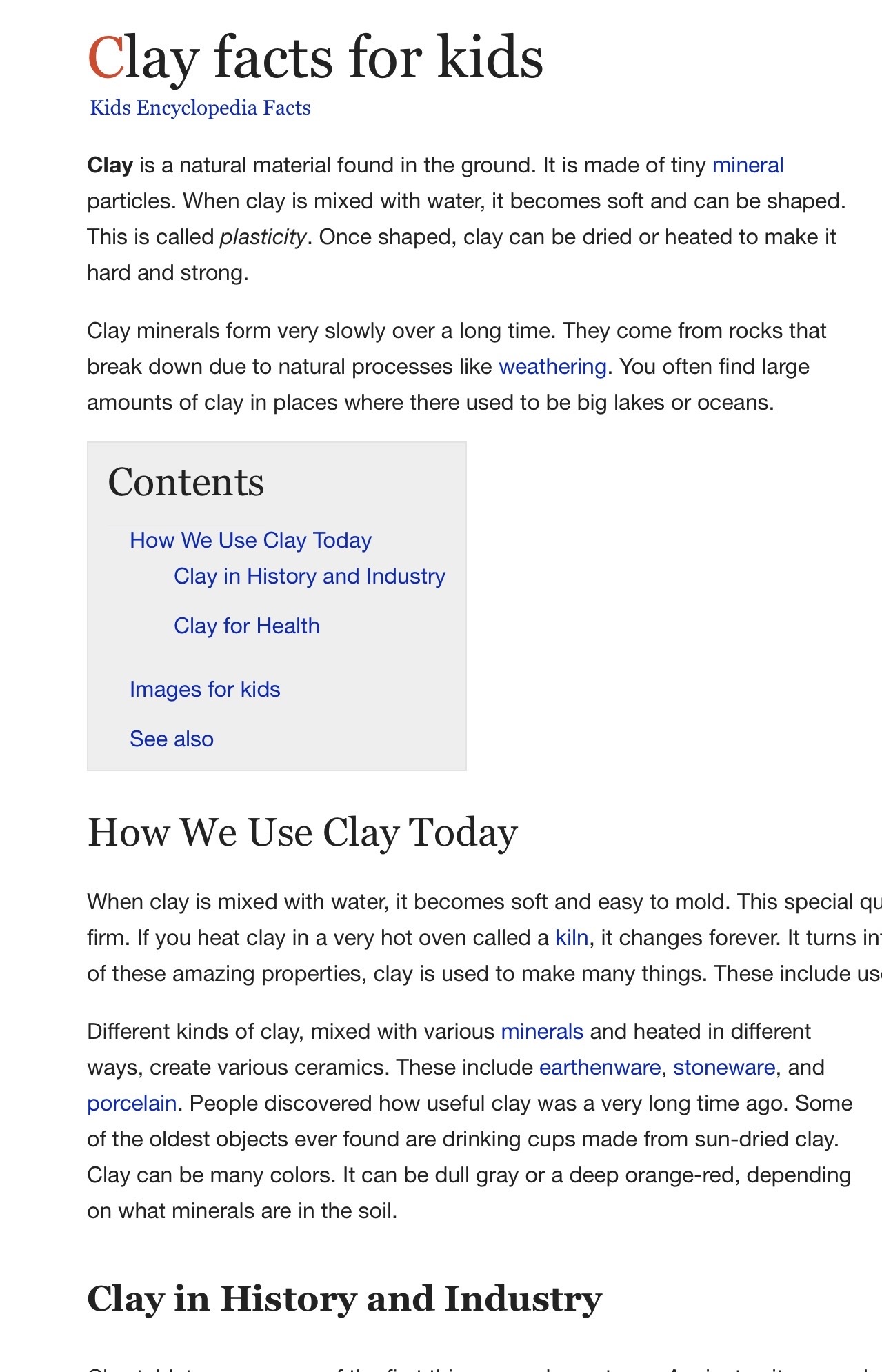 Clay is a natural material made up of tiny particles of rock. When clay is mixed with enough water, it feels like soft, gluey mud.