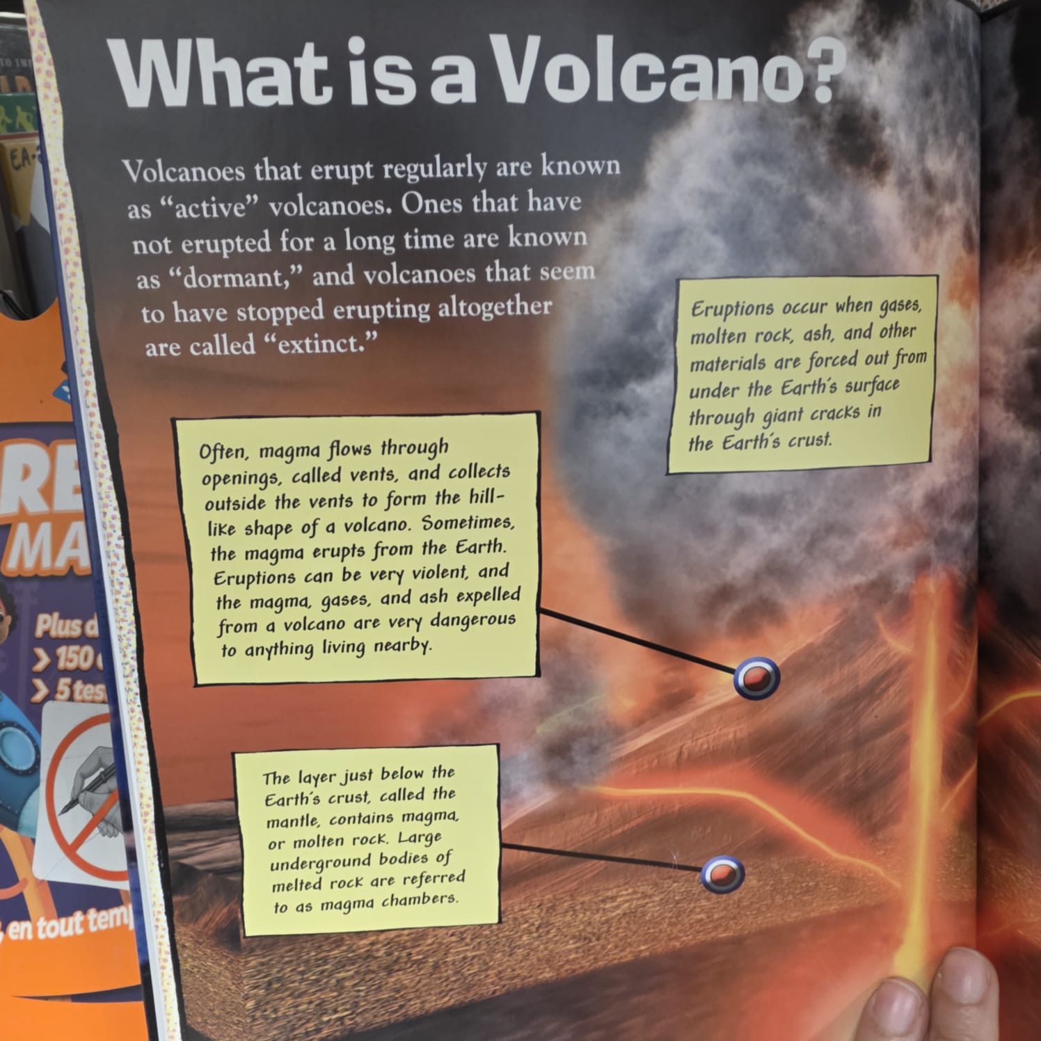 Rock, poisonous gases, ash, and dust all join magma in the violent eruption of the volcano. Some eruptions shoot this material hundreds of yards (meters) into the air, or tumble down hills laying waste to everything in its path. Many volcanoes lie dormant, without erupting, for hundreds or thousands of years, before exploding. This makes some volcanoes unpredictable as well as deadly.