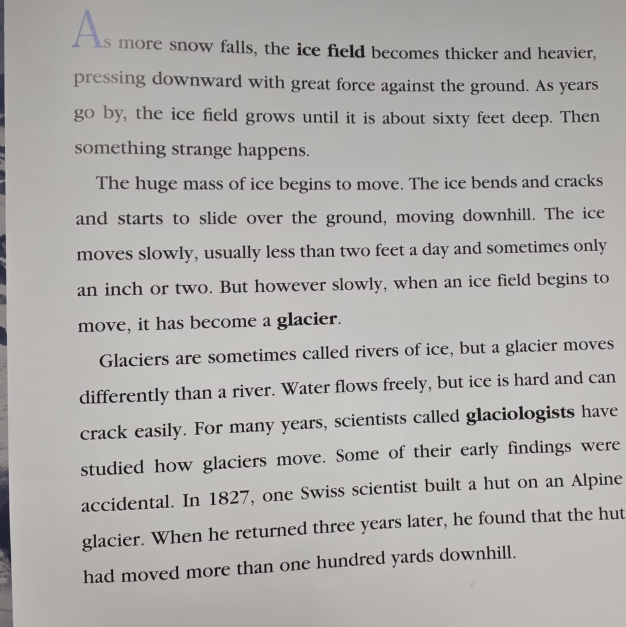 Glaciers are sometimes called rivers of ice, but a glacier moves differently than a river. Water flows freely, but ice is hard and can crack easily. For many years, scientists called glaciologists have studied how glaciers move. Some of their early findings were accidental. In 1827, one Swiss scientist built a hut on an Alpine glacier. When he returned three years later, he found that the hut had moved more than one hundred yards downhill.