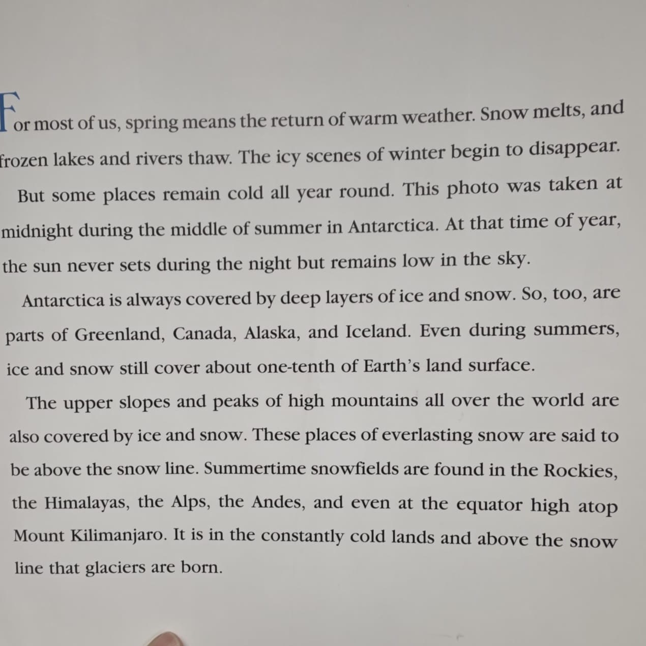 As more snow falls, the ice field becomes thicker and heavier, pressing downward with great force against the ground. As years go by, the ice field grows until it is about sixty feet deep. Then something strange happens.
