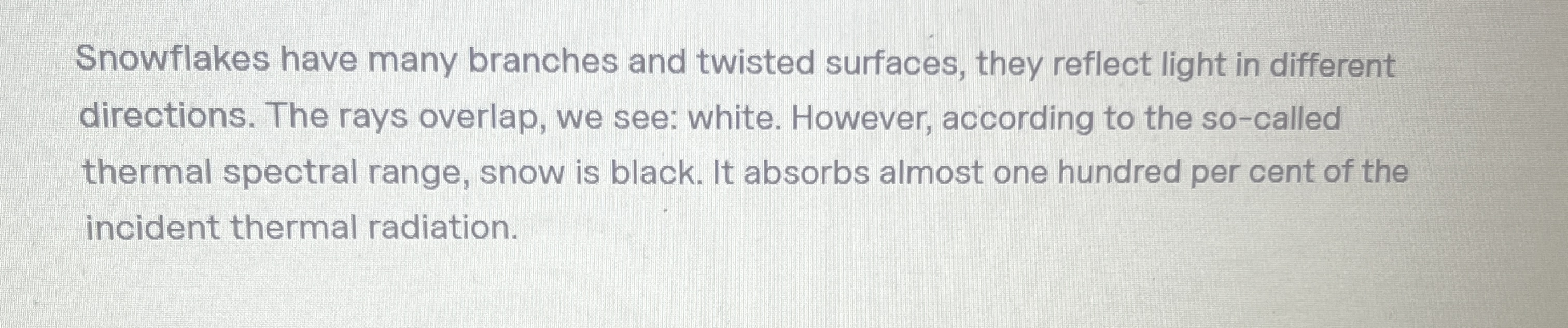 Snowflakes have many branches and twisted surfaces, they reflect light in different directions. The rays overlap, we see: white. However, according to the so-called thermal spectral range, snow is black. It absorbs almost one hundred per cent of the incident thermal radiation.