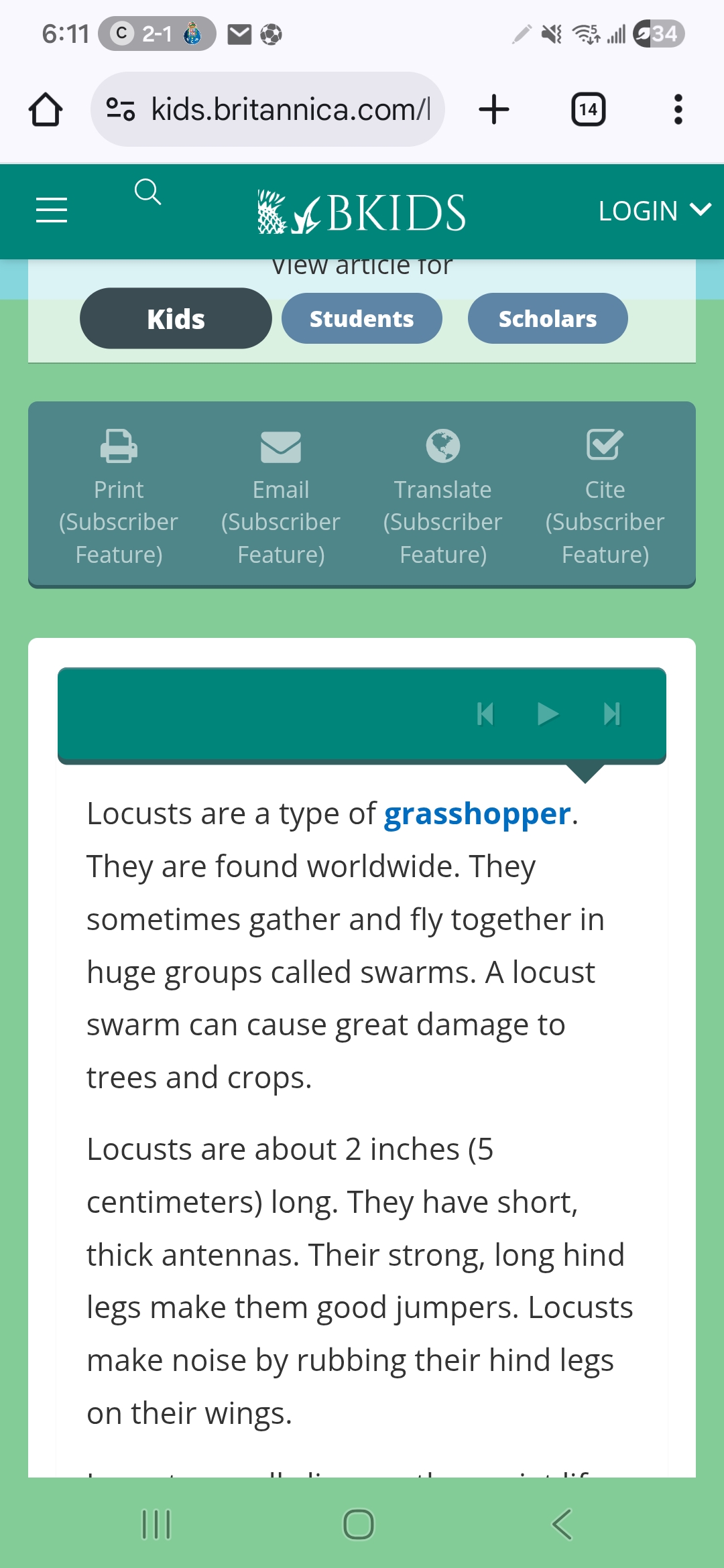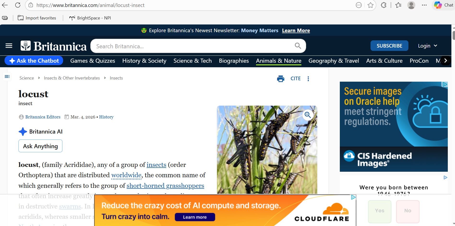 Locusts are a type of grasshoppers who belong to the family called Arcididae. Locusts like to live alone, sometimes when they get hyper, they become a problem. They eat a lot, and if there is a swarm of them, they can DEVOUR anything in their way.