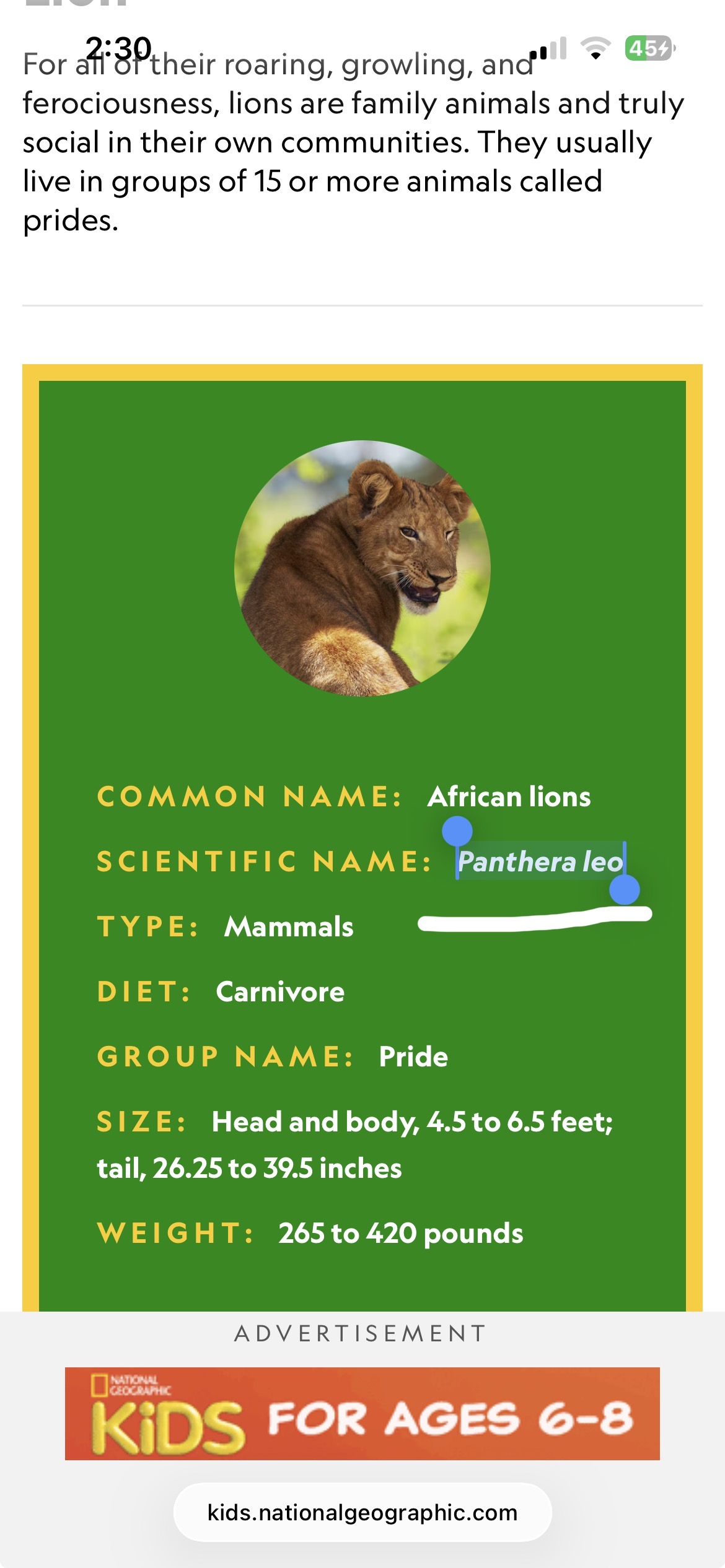 -Lions sientific name is Panthera leo.