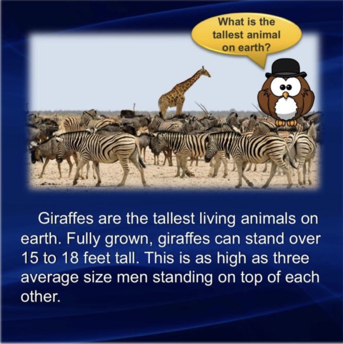 تُعدّ الزرافات أطول الحيوانات الحية على وجه الأرض. إذ يصل طول الزرافة البالغة إلى ما بين 15 و18 قدمًا، أي ما يُعادل تقريبًا طول ثلاثة رجال متوسطي الحجم يقفون فوق بعضهم البعض. تعيش الزرافات في سهول أفريقيا الشاسعة المفتوحة، وتتغذى على النباتات، بما في ذلك الأوراق والأغصان والزهور والثمار