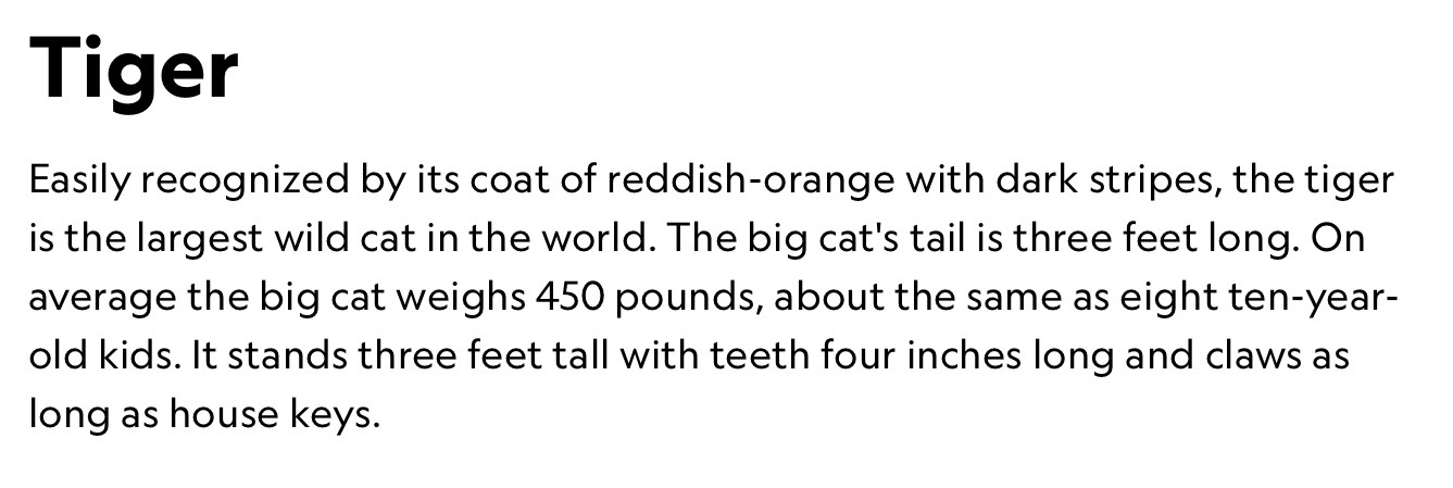 يسهل تمييز النمر بفروه البرتقالي المحمر المميز بخطوطه الداكنة، وهو أكبر أنواع القطط البرية في العالم. يبلغ طول ذيله ثلاثة أقدام. يزن النمر في المتوسط 450 رطلاً، أي ما يعادل وزن ثمانية أطفال في العاشرة من عمرهم. يبلغ طوله ثلاثة أقدام، وله أسنان بطول أربع بوصات، ومخالب بطول مفاتيح المنزل