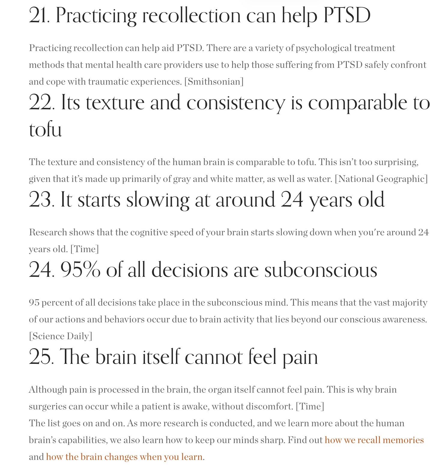يُعدّ الدماغ البشريّ بالغ القوة والتعقيد. فهو قادر على تخزين كمّ هائل من المعلومات، ويتحكّم بكلّ ما نفكّر فيه، ونشعر به، ونتصرّف به. ورغم أنّه لا يتجاوز وزنه ثلاثة أرطال، إلا أنّه يستهلك الكثير من طاقة الجسم وأكسجينه. تُخزّن الذاكرة في أجزاء مختلفة من الدماغ في آنٍ واحد، حيث تعمل الذاكرة قصيرة المدى والذاكرة طويلة المدى معًا. قد تبدأ الذاكرة حتى قبل الولادة، لكنّها ليست مثالية دائمًا، لأنّ العواطف قد تؤثّر على طريقة تذكّرنا للأشياء.