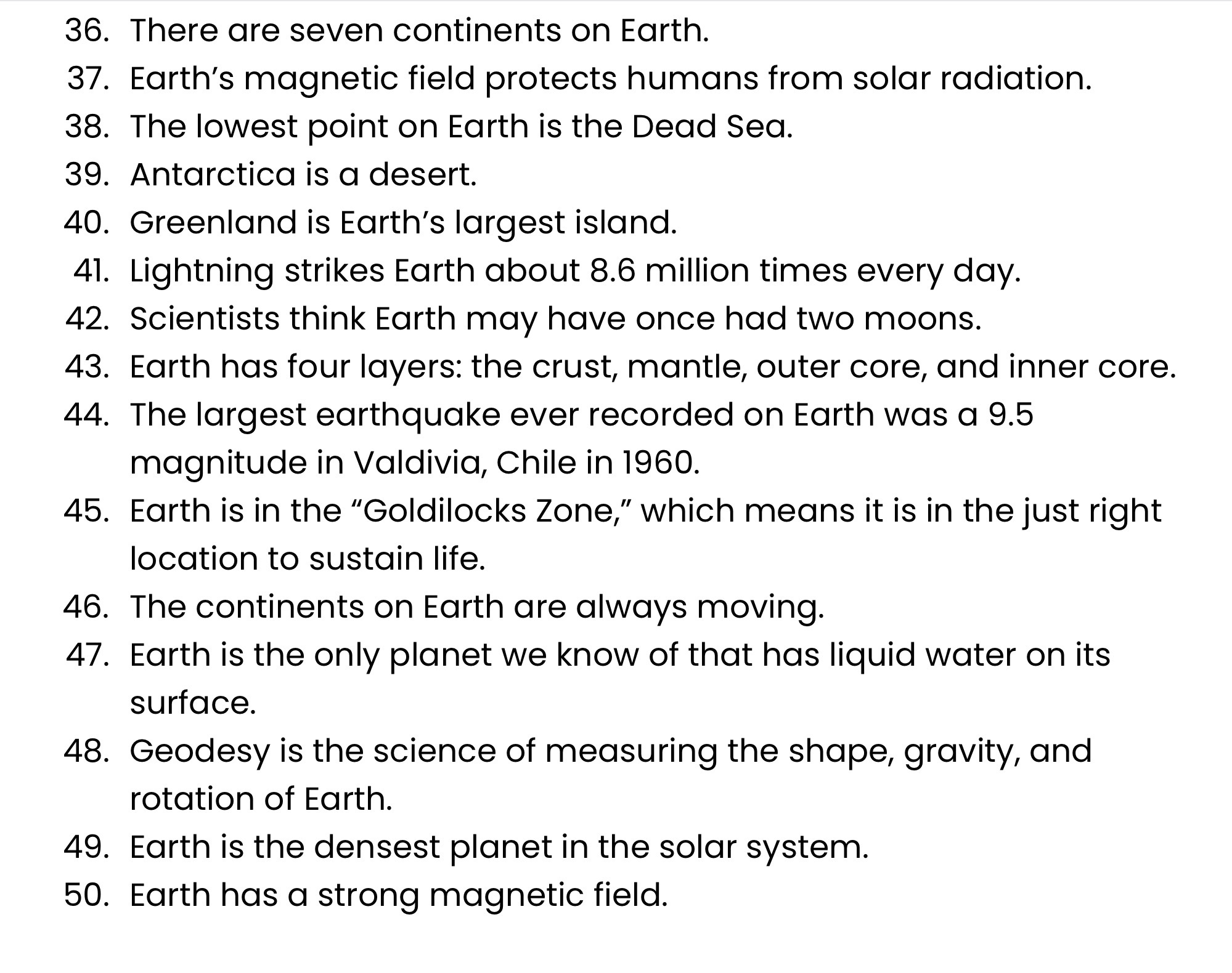 الأرض كوكبٌ فريدٌ ومميزٌ يدعم الحياة. إنها الكوكب الوحيد المعروف الذي يحتوي على الماء السائل والأكسجين، ويتمتع بالمسافة المناسبة من الشمس. يغطي المحيط حوالي 71% من سطحها، ويحمي غلافها الجوي ومجالها المغناطيسي الكائنات الحية. الأرض في حركة دائمة، فهي تدور حول محورها وتدور حول الشمس، مما يُسبب تعاقب الليل والنهار والفصول. تتكون من أربع طبقات رئيسية ونواة شديدة الحرارة تتكون في معظمها من الحديد.