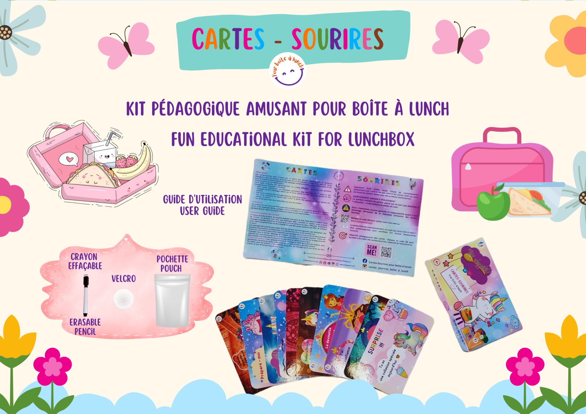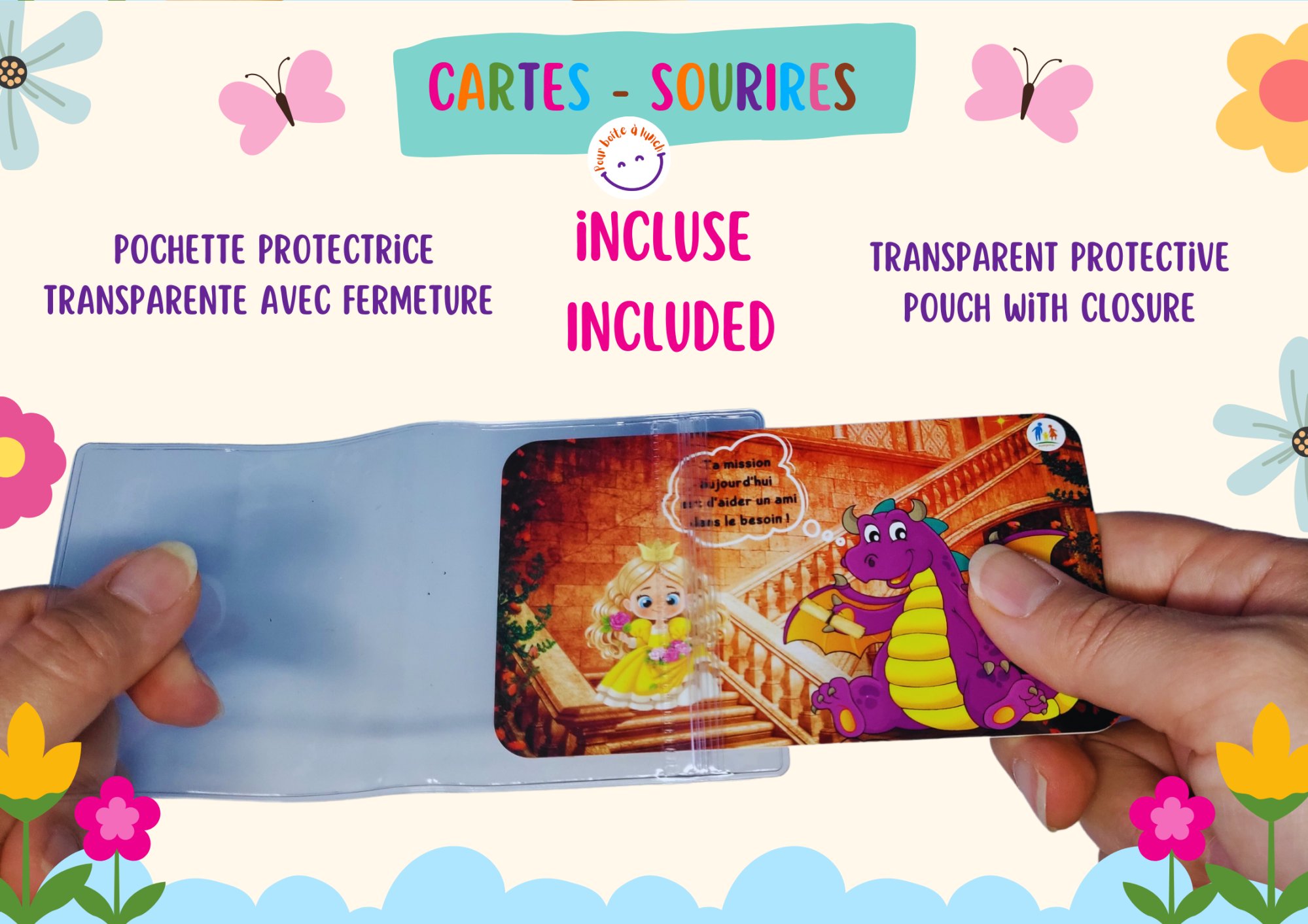 Utilisation: Les cartes sont conçues pour être mises dans la boîte à lunch des enfants. Ainsi, pour les faire durer, il est important de les protéger contre l’humidité et les dégâts en les plaçant dans la pochette incluse, dans une poche séparée ou dans un sac imperméable.