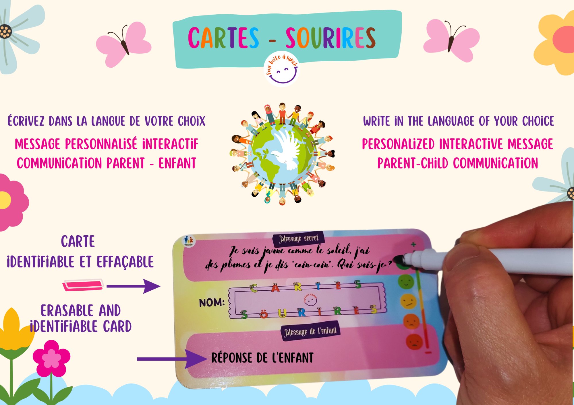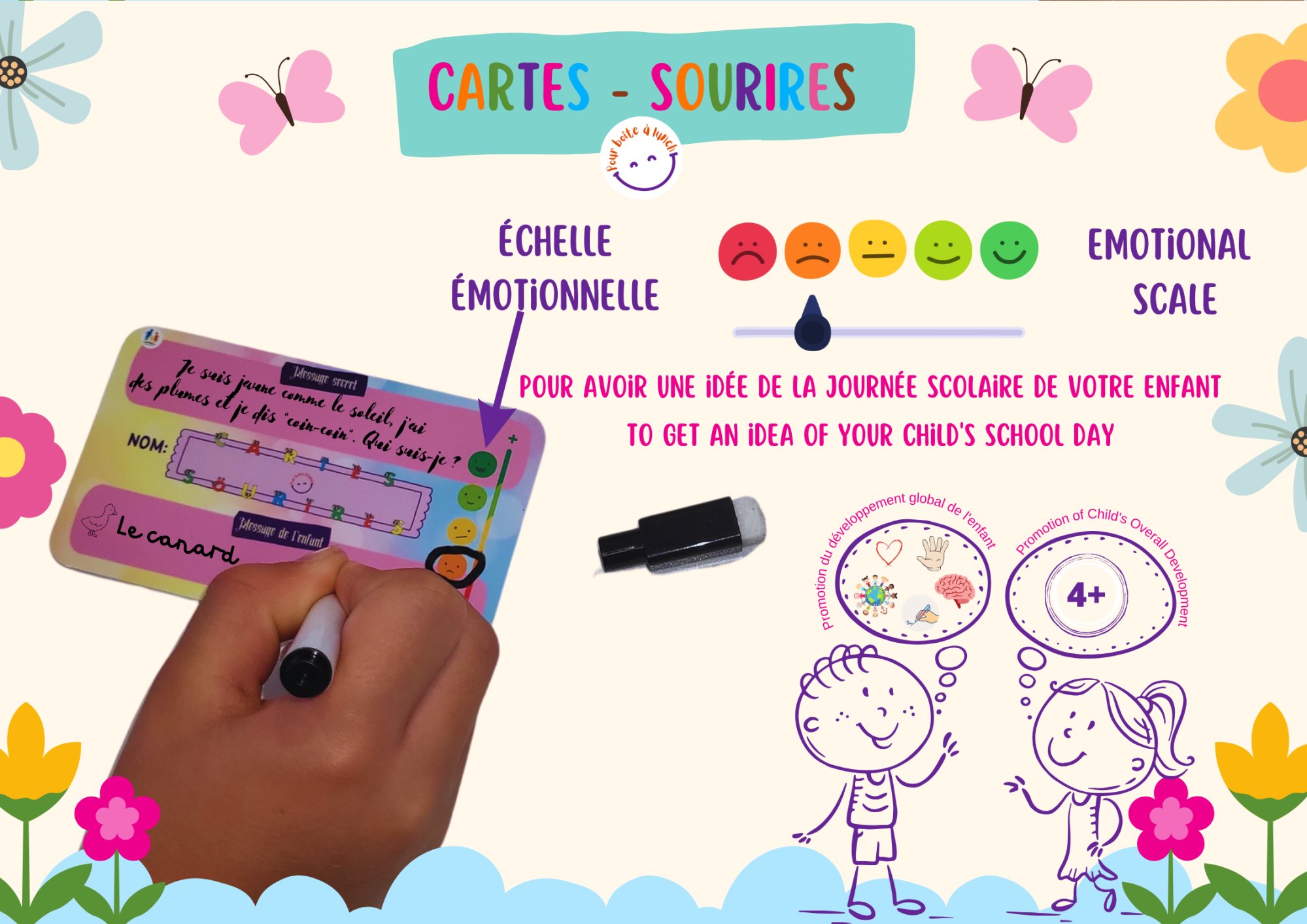 Une vision pédagogique unique en son genre : Ces cartes sont conçues à être utilisées par les parents et par les enfants aussi. Les parents pourraient s'en tenir aux messages déjà imprimés sur le recto des cartes ou ajouter leurs propres messages (message secret) sur le verso des cartes en utilisant le crayon effaçable. À leur tour, les enfants pourraient répondre aux messages des parents ou écrire leurs propres messages dans la section "Message de l'enfant". La section enfant comporte aussi une échelle émotionnelle leur permet d'expliquer leurs émotions et leur expérience scolaire d'une façon quotidienne.